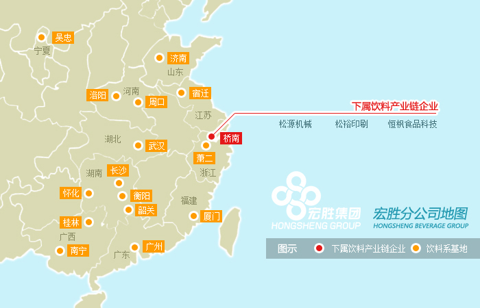 宏勝集團擁有20多年的生產經驗,以及全球領先的自動化生產線,參與國際競爭,承接各類飲料OEM業務。共有飲料系企業36家,分布杭州、長沙、武漢、濟南、廣州等16個基地。 生產基地:布局全國,產地直銷 組建六大區域,整合區域內的生產、物流、人員、銷售,提高市場反應靈活性。遍布全國的生產基地、實現500公里半徑市場覆蓋。