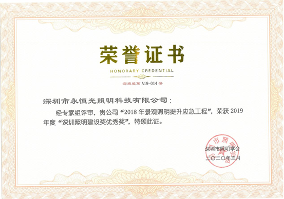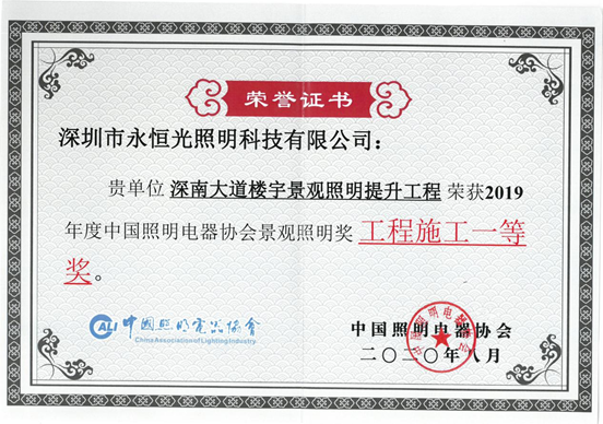 2020年8月2日,深圳市永恒光照明科技有限公司在“2020中國景觀照明產業大會開幕式暨中國照明電器協會景觀照明頒獎典禮”上,榮獲2019年度中國照明電器協會景觀照明獎工程施工優秀單位、2019年度中國照明電器協會景觀照明獎工程施工一等獎、2019年度中國照明電器協會景觀照明獎工程施工三等獎等3項獎項。