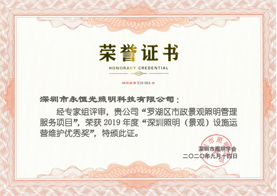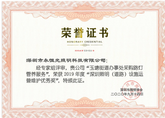 2020年9月18日,深圳市永恒光照明科技有限公司在“智慧基礎設施暨智慧桿建設論壇”和第十七屆“深照獎”頒獎典禮中,榮獲2019年度“深圳照明(景觀)設施運營維護優秀獎”、2019年度“深圳照明(道路)設施運營維護優秀獎”、2019年度“深圳照明建設獎優秀獎”等4項獎項。