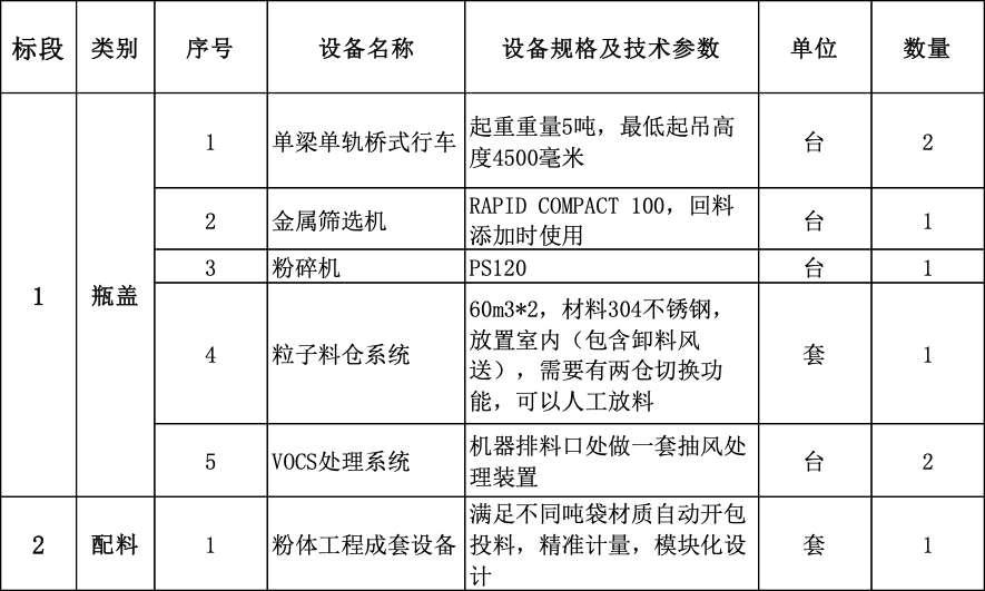 本次宏勝飲料集團(tuán)杭州蕭山智能化工廠項目瓶蓋與配料標(biāo)段設(shè)備需求見下表,內(nèi)容包括設(shè)備供應(yīng)、指導(dǎo)安裝調(diào)試和售后服務(wù)等。詳細(xì)需求待報名且審核通過后與相應(yīng)技術(shù)部門對接。